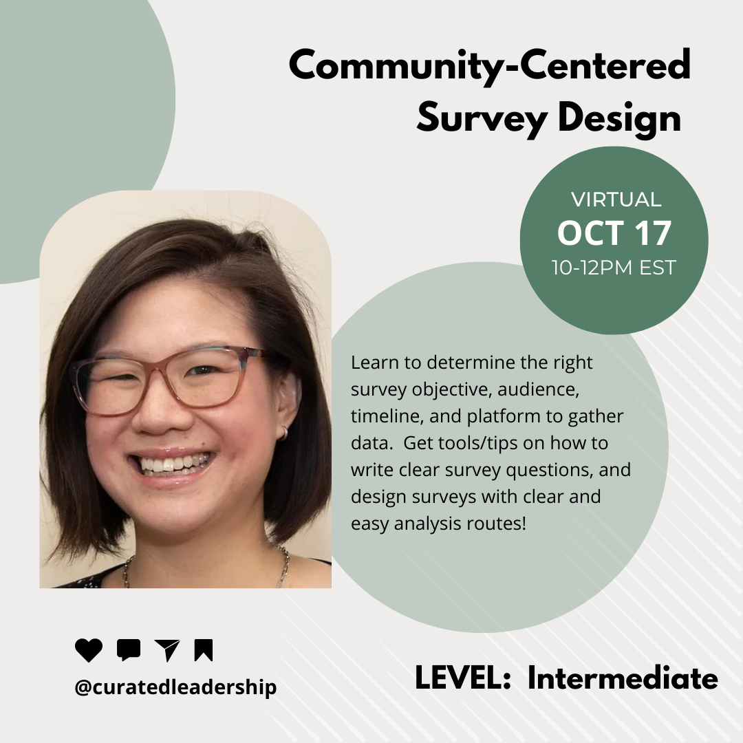 In this interactive session, you will learn how to collect data that identifies gaps, benchmarks sentiments, and explore new ways to engage your community meaningfully. You will learn how to determine the right survey objective, audience, timeline, and platform to gather data, understand how to write clear survey questions for honesty and flexibility, and design surveys with clear and easy analysis routes that link to actionable opportunities!